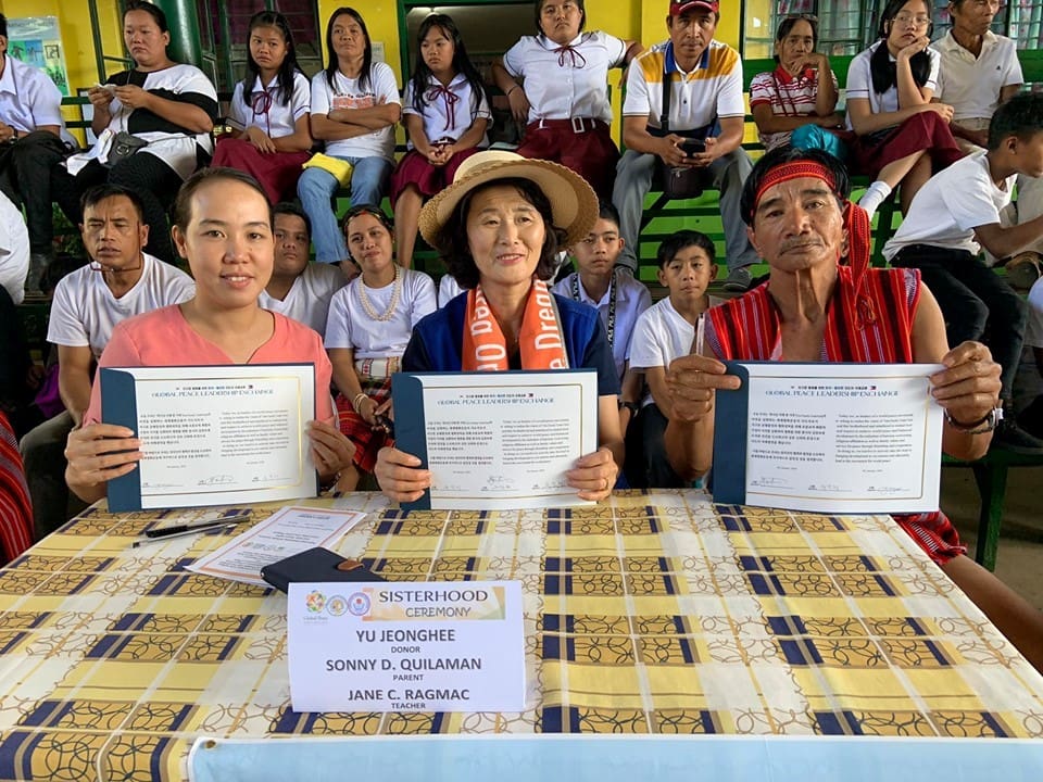 The second part of the program included the sisterhood ceremony led by Madam Jenifer S. Villarosa, a teacher from the school department. Eleven tables with three representatives for the Korean donors, parents, and teachers signed a sisterhood certificate together to symbolize their union in the ongoing project and their common goal to uplift the vision of One Family under God. The ceremony forged a bond not only among the local community but also between people of different nationalities. Despite having different backgrounds, their friendship was based on mutual love and respect for one another as members of the same human family.