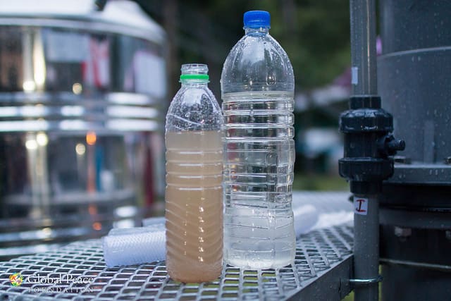 Villagers get water from new water filtration system installed by the volunteers of the Waterful Sharing Campaign